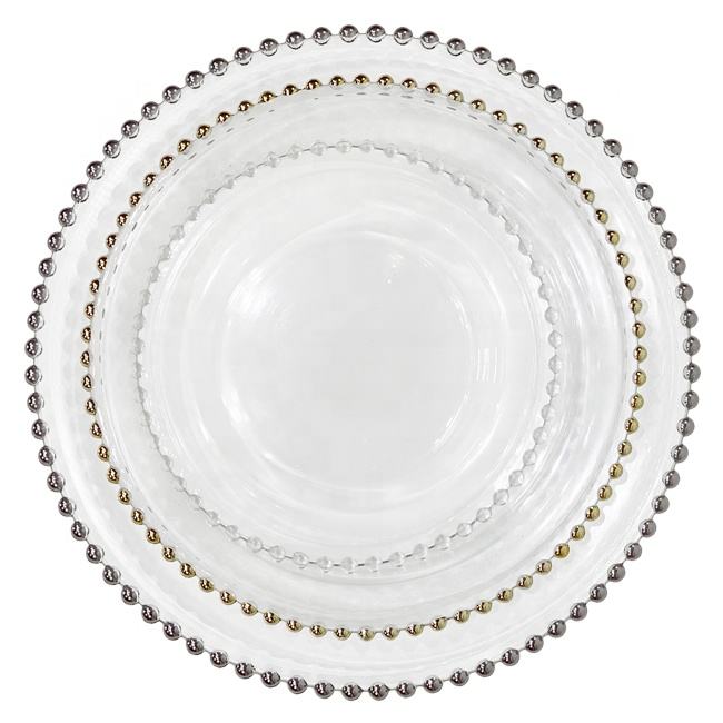 Luxury Hotel Dinning Glass Tableware Belmont Gold Beaded Charger Glass Plate for Wedding